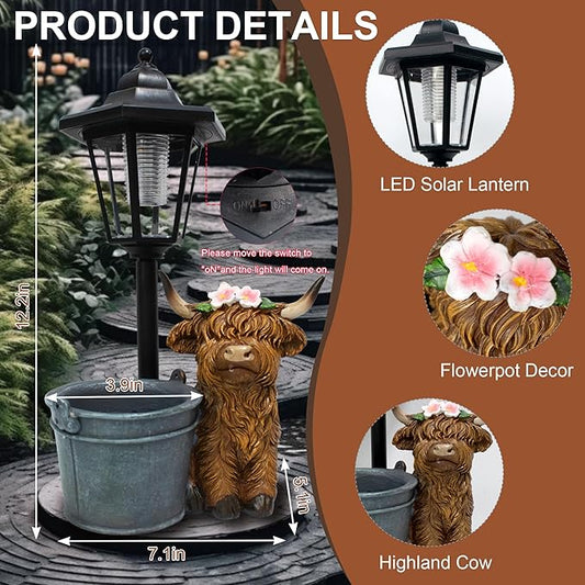 Highland Cow Statues Outdoor Solar Sculptures with Solar Lights and Flowerpot Funny Garden Decor Animal Figurines Resin Outdoor Statues for Patio Yard Lawn Balcony Grandma Mom Gifts