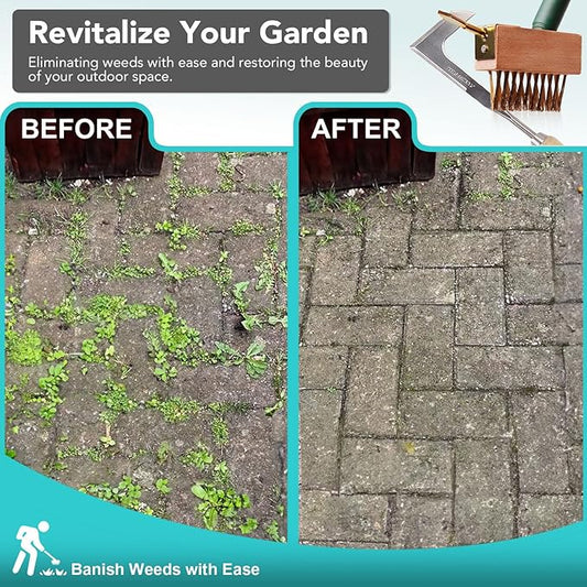 Extendable Weed Brush Telescopic Gardening Tool with Angled Wire Bristles, Spare Heads, and Weeder Scraper for Clearing Weeds, Moss, and Algae from Patios, Driveways, and Block Paving
