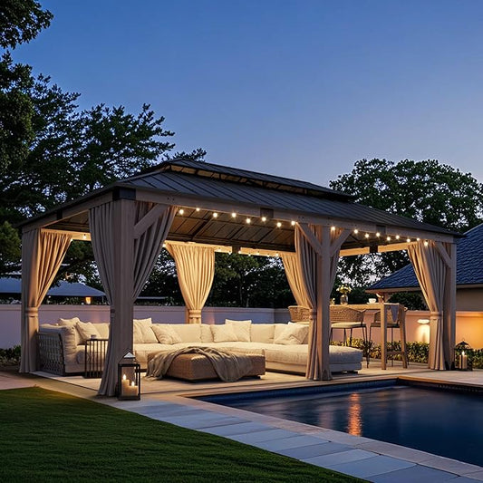 CHARMELEON 12'x20' Cedar Wood Gazebo Hardtop - Wooden Gazebos with Dual Metal Roof - Permanent Outdoor Gazebo - Large All Weather Patio Gazebo for Backyard, Deck & Garden - with Curtains & Netting