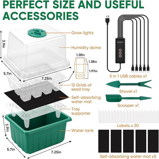 Seedling Starter Trays 5 Packs Seed Starter Tray with Grow Light, Smart Controller Seed Starting Trays Kit with Humidity Dome (60 Cells) Indoor Gardening Plant Germination Trays Black