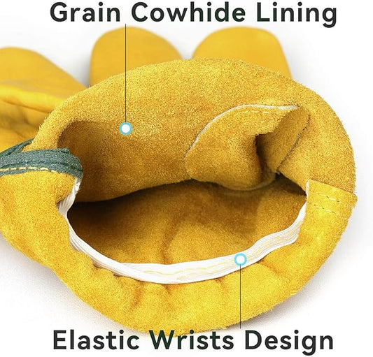 OZERO Leather Work Gloves Flex Grip Tough Cowhide Gardening Glove for Wood Cutting/Construction/Truck Driving/Garden/Yard Working for Men and Women 1 Pair (Gold,X-Large)
