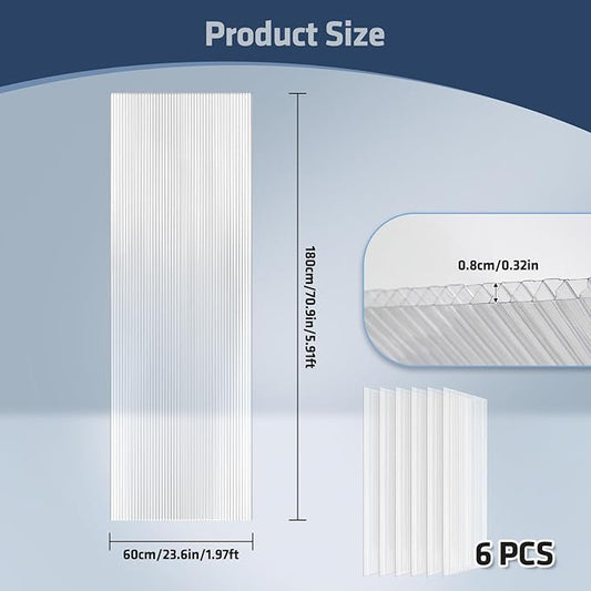 UMIG 6 PCS 6' x 2' x 0.32'' Polycarbonate Greenhouse Panels, Twin-Wall Waterproof UV Protected Corrugated Plastic Roof Panels Sheets, Clear Replacement Panels for Greenhouse, Outdoor, Plant