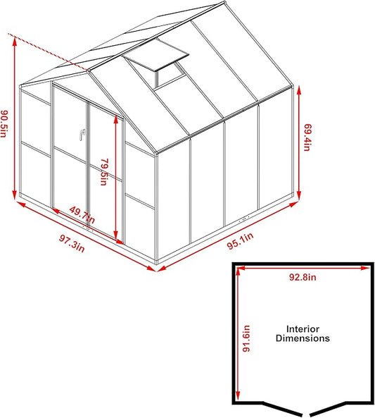 Greenhouse 8x12 FT Aluminum-Framed Heavy Duty Polycarbonate with Quick Setup Structure and Roof Vent, Large Enhanced Outdoors Green House Kit
