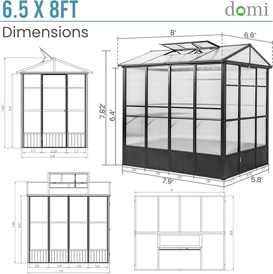 Domi 6.5x8FT Polycarbonate Greenhouse with Automatic Vent, Extra Tall 7.8FT Walk-in Aluminum Frame, Weather-Resistant Green House with Shelves & Hooks for Outdoor Garden, Backyard, Dark Grey