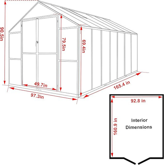 Greenhouse 8x16 FT Aluminum-Framed Heavy Duty Polycarbonate with Quick Setup Structure and Roof Vent Large Enhanced Outdoors Green House Kit