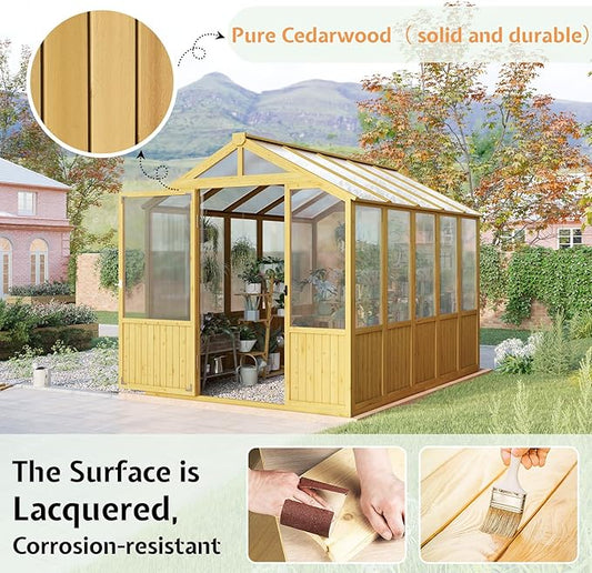 Jocisland 8x9.5x7.5 Ft Wooden Greenhouse, Pre-Assembled Solid Cedar Frame, Walk-in Design, Lockable Door, Adjustable Roof Vents, Polycarbonate Panels for Outdoor, Garden, Backyard