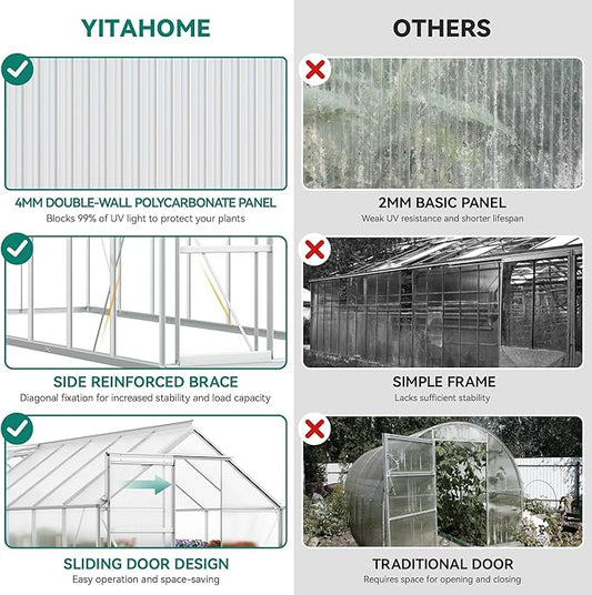 YITAHOME 16x6FT Polycarbonate Greenhouse for Outdoors, Large Heavy Duty Aluminum Greenhouses with Sliding Doors and Vent Window, Walk-in Greenhouse for Garden Backyard, Simple Setup, Silver
