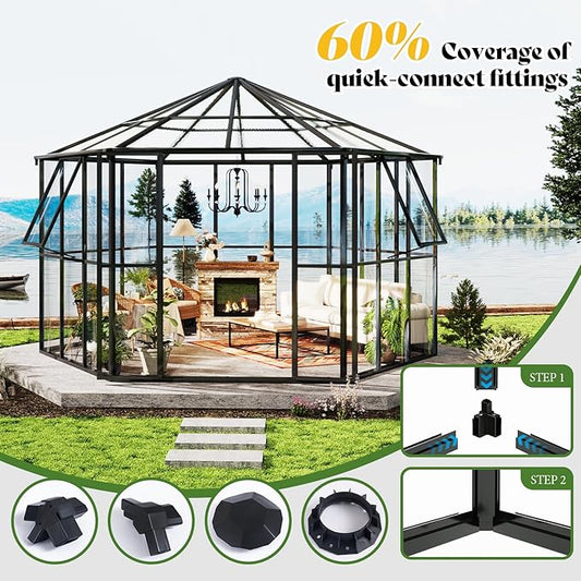 AMERLIFE 12x10x8 FT Hexagonal Hybrid Polycarbonate Greenhouse for Outdoors, Quick-Connect Assembly, Aluminum Frame with Ventilation and Rain Gutter for Backyard Garden, Black