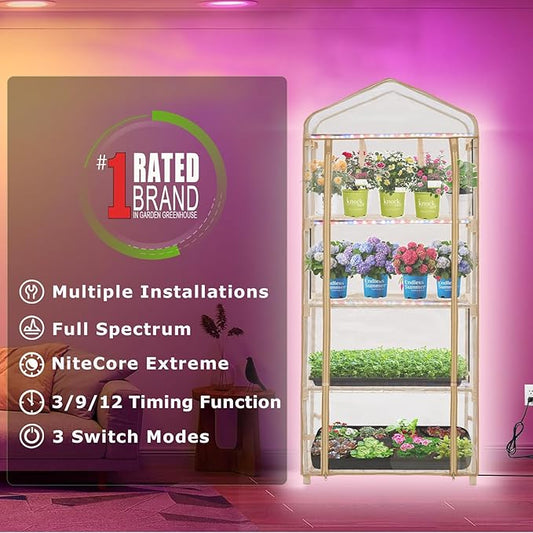 Mini Greenhouse with Grow Light , 4 Tier 27.2" ×19.9" ×61.8" Portable Greenhouse with Zippered for Seed Starting Trays , Dimmable 2ft 60W Plant Light for Indoor Plant with Timer(PLGH704OWPT)