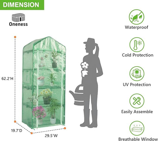 Oneness Mini 4-Tier Greenhouse, Indoor and Outdoor Reusable Portable Warm House with Green PVC Cover and Metal Shelf for Seeding in All Season, 29.5”W x 19.7”D x 62.2”H