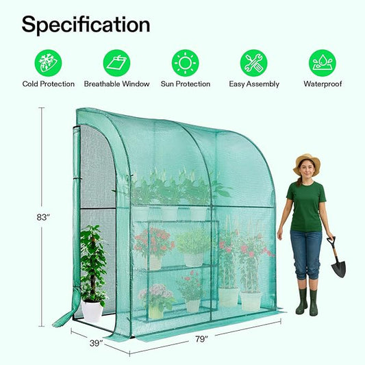 VIVOSUN Lean-to Greenhouse, 6.6’ x 3.3’ x 6.9’ Portable Wall House with Green PE Cover and Shelf for Compact Garden 79x39x83-Inch