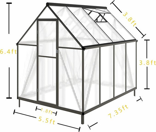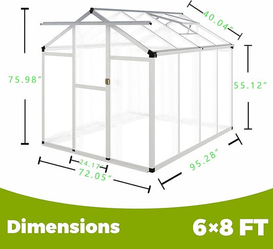 Aluminum Greenhouse for Outdoors, 6 x 8 FT Polycarbonate Walk-in Greenhouse with Quick Setup Structure and Adjustable Roof Vent, Silver