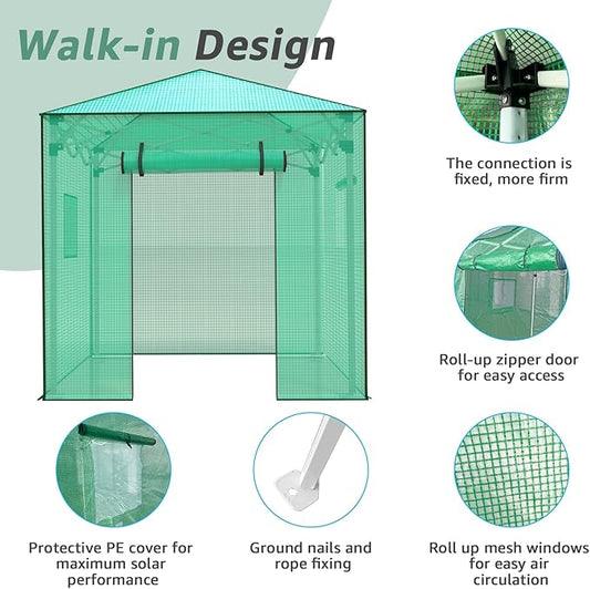 8x8 FT Portable Walk-in Greenhouse with 2 Mesh Roll-Up Windows & Roll-up Zipper Door - Easy Setup for Indoor/Outdoor Gardens, PE Cover, Green