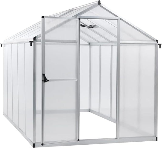 Aoodor 6 x 10 Ft Walk-in Greenhouse with Gutter, Polycarbonate and Heavy-Duty Aluminum Frame, Adjustment Skylight and Lockable 2-Sided Door for Patio, Outdoor, Yard, Lawn Use, Silver