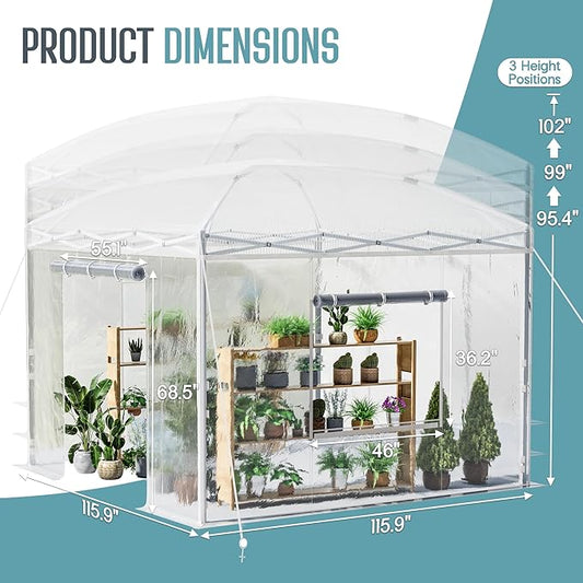 Specraft 10×10×8.5 FT Outdoors Pop-up Greenhouses with Adjustable Reinforced Frame, Portable Walk in Greenhouse with 2 Roll-up Zipper Door, Mesh Windows, PE Cover, White