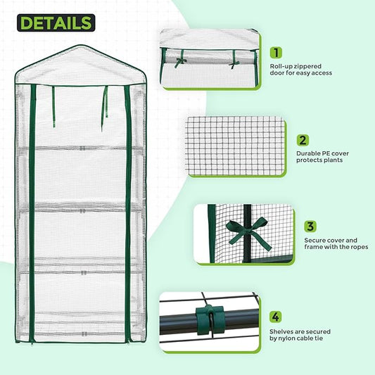EAGLE PEAK Mini Greenhouse with Wire Shelves, Portable Indoor & Outdoor Green House with Roll-Up Zipper Door, 4 Tier, 27.2"x19.3"x64.2", Clear/White PE Cover