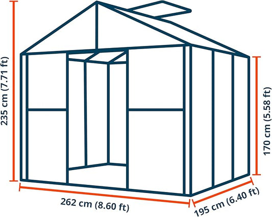 Greenhouse Rubin 3 Aluminum Frame 8.6 x 6.4 ft with Approx. 10 mm Polycarbonate Panels - with 2 Extra Skylights and 2 Automatic Window Openers