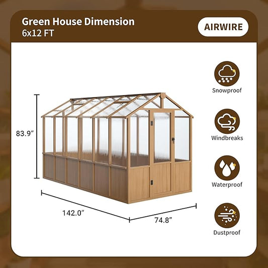 6x12 FT Wooden Greenhouse for Outdoors, Walk-in Greenhouse with 6MM Thick Polycarbonate Panel and Adjustable Roof Vents, Garden Backyard, Wood Colour