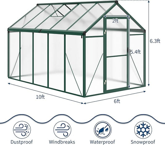 6x10 FT Walk in Greenhouse Aluminumfor , with Roof Vent, Groud Nail, Lockable Push Door, Aluminum Frame and Poly Carbonate Material with Quick Setup Graden, Vegetable Garden and Leisure Room