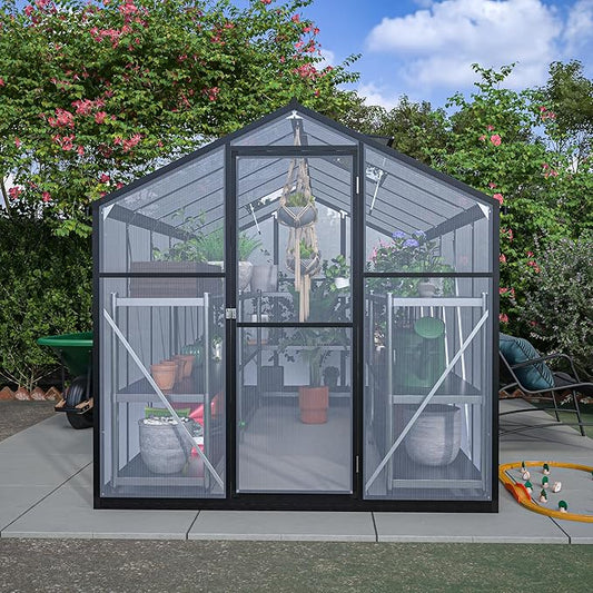 8X8 FT Greenhouses for Outdoors,Polycarbonate Greenhouse, Aluminum Heavy Duty Walk-in Green Houses, Adjustable Roof, Raised Base and Double Sliding Door for Outside Backyard, Black
