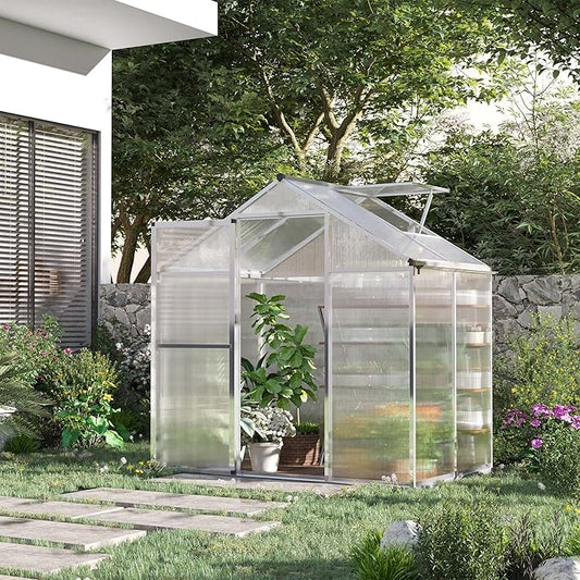 6x8 FT Greenhouse for Outdoors, Polycarbonate Flower Greenhouse with Roof Vent, Push-Pull Lockable Door, Aluminum Walk-in Greenhouses for Outside Garden Backyard, Patio, Lawn, Silver