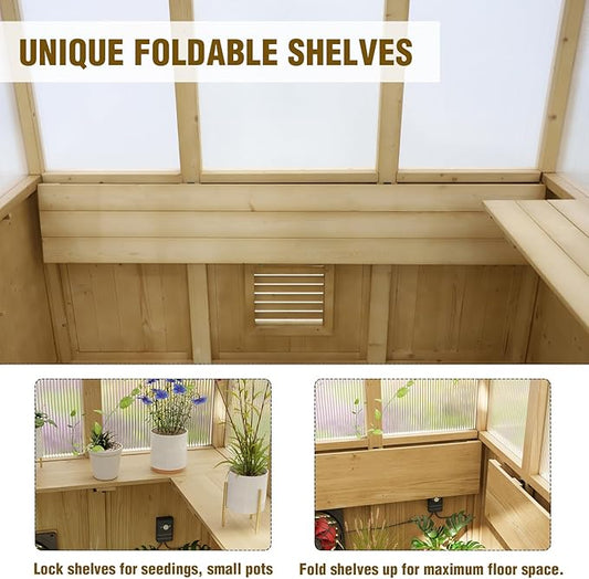 Macrout Cold Frame Greenhouse, Tall Wooden Greenhouse for Outdoor Indoor Use with Polycarbonate Panels, 3 Tier Garden Cold Frame with Drawer and Shelves, 0864 (Natural)