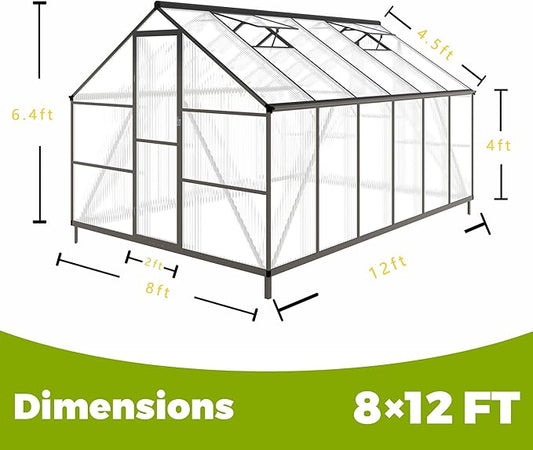 8x12 FT Greenhouses for Outdoors, Polycarbonate Greenhouse with PC Panels, Greenhouses for Outdoors for Yard, Garden, Hobby, Dark Grey