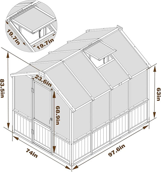 BlueWish 8x10 FT Greenhouse Kit, Wood Greenhouses with 6MM Polycarbonate Panel, Green House with Adjustable Vent & Lockable Door, Walk-in Greenhouse for Outside, Garden, Backyard