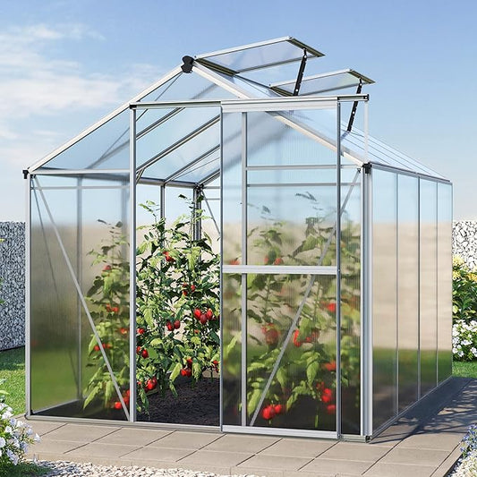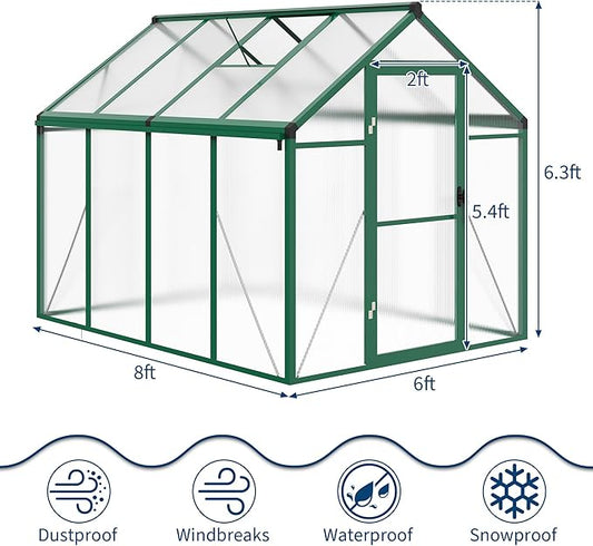 6 x 8 FT Greenhouse, Greenhouses for Outside, Polycarbonate Greenhouse with Aluminum Frame, Lockable Door and Ajustable Roof Vent for Backyard, Green Houses for Outside Garden Backyard, Patio
