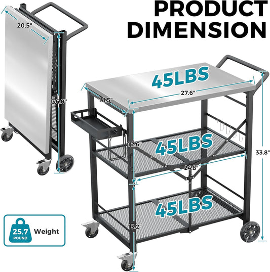 Ciokea Folding Outdoor Grill Cart with Wheels, 3-Shelf Grill Table with 27x18 in Stainless Steel Top, Rolling Pizza Oven Stand, Metal Portable Cart for BBQ Patio Camping (Black)