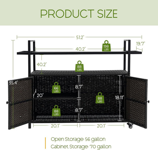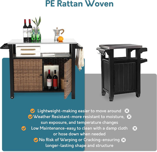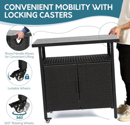 Outdoor Indoor Storage Cabinet with Rolling Wheels, Patio Serving Cart with Bar Table and Wicker Cabinet, Kitchen Island Prep Table, Black