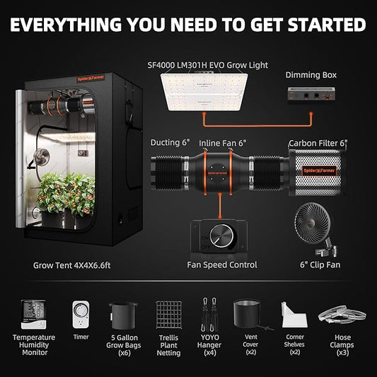 Spider Farmer Grow Tent Kit Complete 4x4ft SF4000 Dimmable Samsung LM301H EVO LED Diodes, 450W Complete System 4x4x6.6 Grow Tent Set 48"x48"x80" with 6" Ventilation System & 6'' Clip Fan