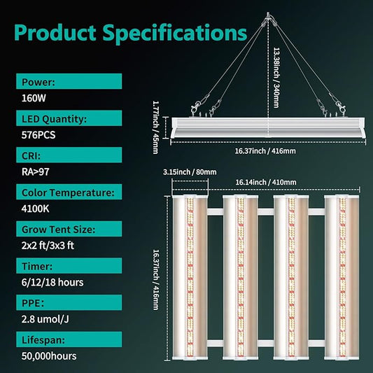 JESLED T8 1.4FT/16inch 160W Full Spectrum Plant Growing Lights with Timing Function, Plug in Suspended Fixture for Greenhouse Cultivation, 2x2/3x3ft Grow Tent Room, Laboratory Plant Cultivation