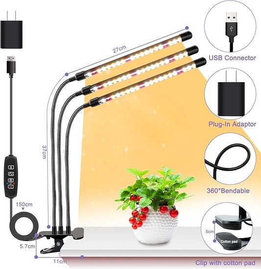 3head Plant Lights, 2Pack Grow Lights for Seed Starting, Full Spectrum Growing Lamps with Clip for Indoor Plants, Auto ON & Off Timer 3/9/12H, 3 Switch Modes, 10-Level Dimmable Brightness