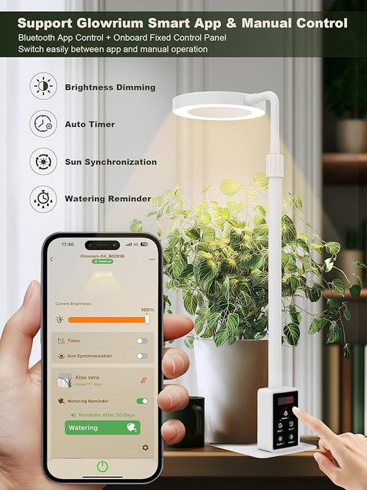GLOWRIUM Smart LED Grow Lights for Indoor Plants, Desk Plant Light with Bluetooth App Control, 12W Full Spectrum Grow Lamp, Height Adjustable 16"-23", Auto Timer, Watering Reminder for Small Plants
