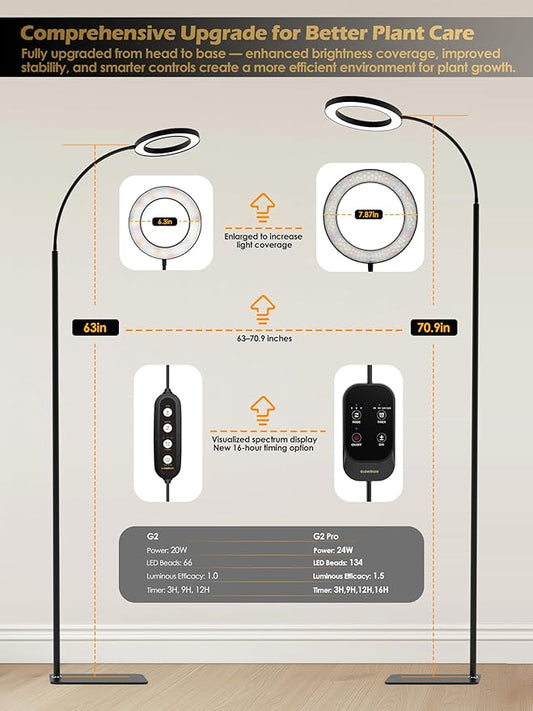 GLOWRIUM Grow Lights for Indoor Plants,Plant Light with 3/9/12/16H Grow Light Timer,2-Head 48W Full Spectrum LED Grow Light, 3 Lighting Mode and Stepless Dimming (Black, 48W)