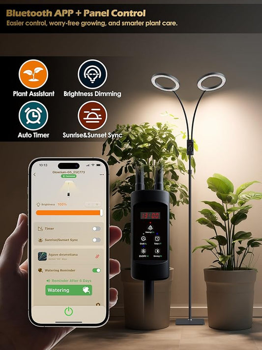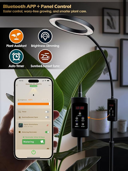 GLOWRIUM Smart Grow Lights for Indoor Plants with Auto Timer, Full Spectrum LED Floor Plant Light for 3 Spectrum Modes,6 Dimmable Levels,63inch Adjustable Height for Large Plants (Black, 20W)