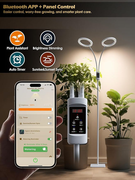 GLOWRIUM Grow Light with Stand,2-Head LED Plant Light for Indoor Plants, Full Spectrum Grow Lamp, 3/9/12H Timer, 6 Dimmable Levels, 3 Lighting Mode, Adjustable Height