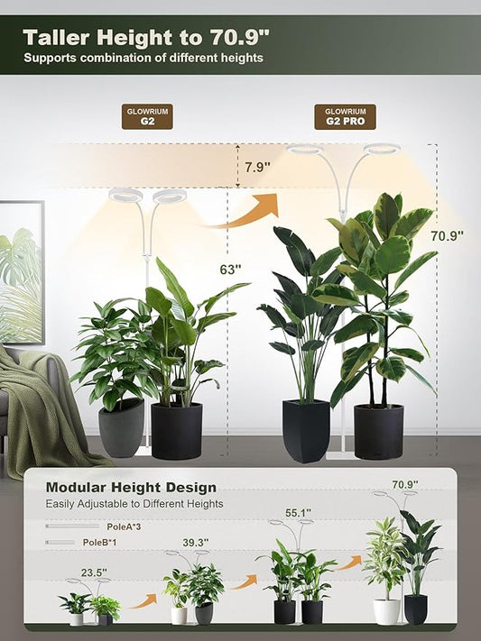 GLOWRIUM 48W LED Dual-Head Grow Light for Indoor Plants, 23.5-71" Adjustable Height, 3-Growing Full Spectrum for Tall Plant Light, 3/9/12/16H Timer, 6-Level Dimming, Ideal for Large Tall Plants
