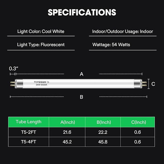 VIVOSUN T5 Grow Light Bulbs 4 Ft 46 Inches, 54W 6500K HO Fluorescent Tubes Light Bulbs, Cool White T5 Bulb for 46 Inches T5 Light Fixtures, T5 Grow Lights for Indoor Plants, 4 Ft 54W Pack of 5