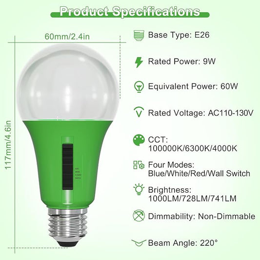 ORALUCE LED Grow Light Bulb 4 Modes, 60 Watt Equivalent Grow Bulbs for Indoor Plants E26 Base, A19 Plant Light Bulb for Seed Starting, Growth, Flower, Vegetables, Non-Dimmable, 1 Pack