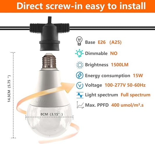 A25 Bulb Plus Size, 15W Grow Bulb,150W Equivalent,LED Grow Light Bulbs, Full Spectrum Grow Lighting, Plant Light Bulbs E26 Base, Grow Light for Indoor and Outdoor Plants (Grow Bulb 2-Pack)