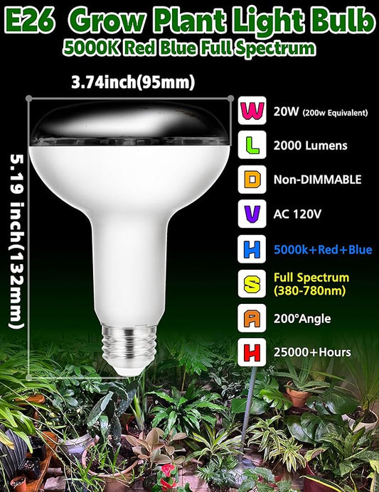 BR30 LED Grow Light Bulbs Floodlight 5000K Red Blue Full Spectrum, 20W E26 Plant Light Bulb 200w Equivalent, Balanced Spectrum for Indoor Plants, Seeding, Growing, Hydroponic, 2000lm, 2pcs