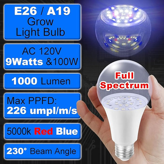 Full Spectrum Grow Light Bulbs 9W E26 A19 Sun Plant Growing Bulb 100W Equivalent with 5000K Red Blue LEDs for Indoor Small Plants Growing, Indoor Greenhouse, Indore Garden, Hydroponics, School, 1 Pack