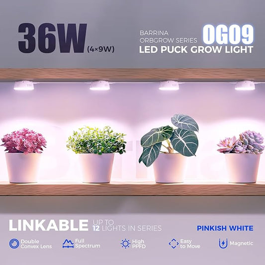 Barrina Orbgrow OG09 Puck LED Grow Light, Pinkish White 36W(4 x 9W, 540 Watt Equiv), Plant Lights for Indoor Plants Full Spectrum, Magnetic & Linkable, Small Grow lamp for Plant Shelf, 4 Packs