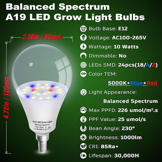 Grow Light Bulbs E12 Candelabra Small Screw Base for Indoor Plants Full Spectrum,Grow LED Light Bulb 10W with Balanced Spectrum 5000K Blue Red for Seeds Greens Laboratory,School,Greenhouse Garden,6Pcs