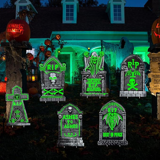 6Pcs Large Halloween Tombstones Yard Sign Graveyard Decor, 25"x16" Glowing Cemetery Props, Light Up Tombstones for Outdoor Halloween Displays, Reusable Weatherproof Gravestones for Grave Decorations