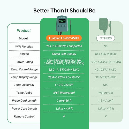 WiFi Digital Heat Mat Thermostat Controller, 32-113°F with Heating Cooling Mode, 365 Day Data Export, 1200W, High/Low Temp Alerts, Plug & Play for Reptile Seedling Brewing Breeding Greenhouse