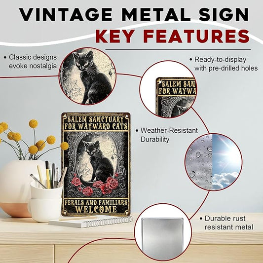 Halloween Black Cat Vintage Sign Salem Sanctuary For Wayward Cats Halloween Metal Sign for Home Bar Kitchen Hotel Dining Room Coffee 8x12inch