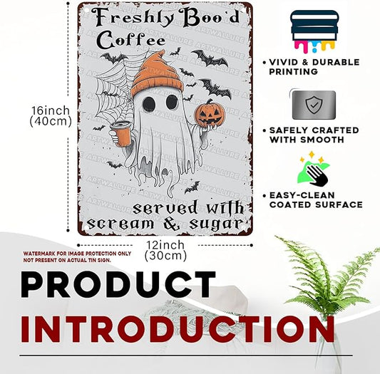 Halloween Rustic Metal Tin Sign Freshly Boo’d Coffee Vintage Fall Decor Retro Tin Plaque Kitchen Wall Art Metal Poster Home Iron Painting Wall Decor 12x16inch